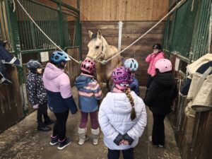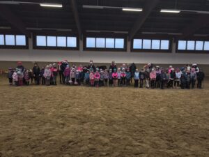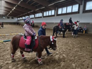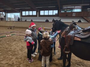 In Gruppen gingen die Kinder in den Stall, um die Pferde und Ponys zu streicheln, putzen und satteln. Sie konnten es kaum erwarten auf den Ponys und Pferden zu sitzen. Ein lebendiges „Gewusel“ erfüllte die Halle, mit geführtem Reiten durch den aufgebauten kleinen Parcour. Auch Steckenpferdchen konnten ausprobiert werden.
